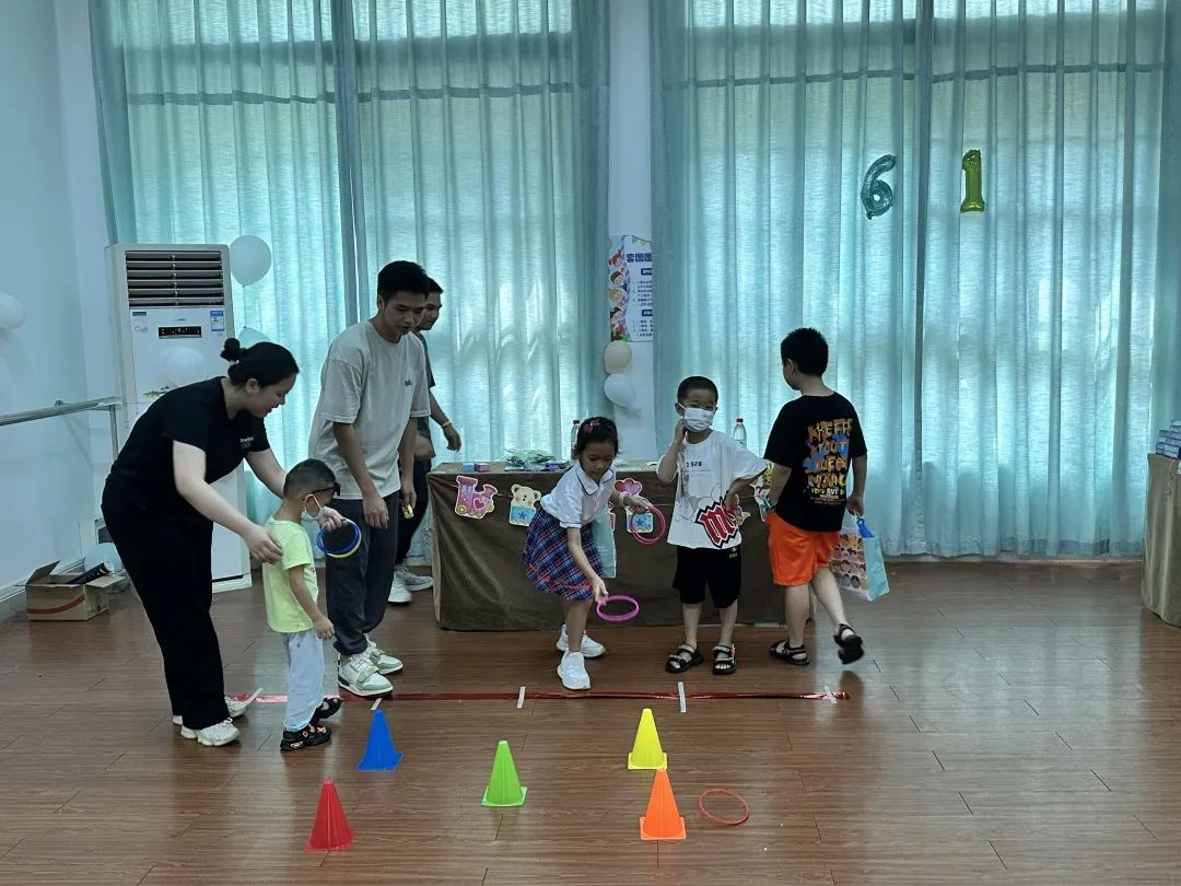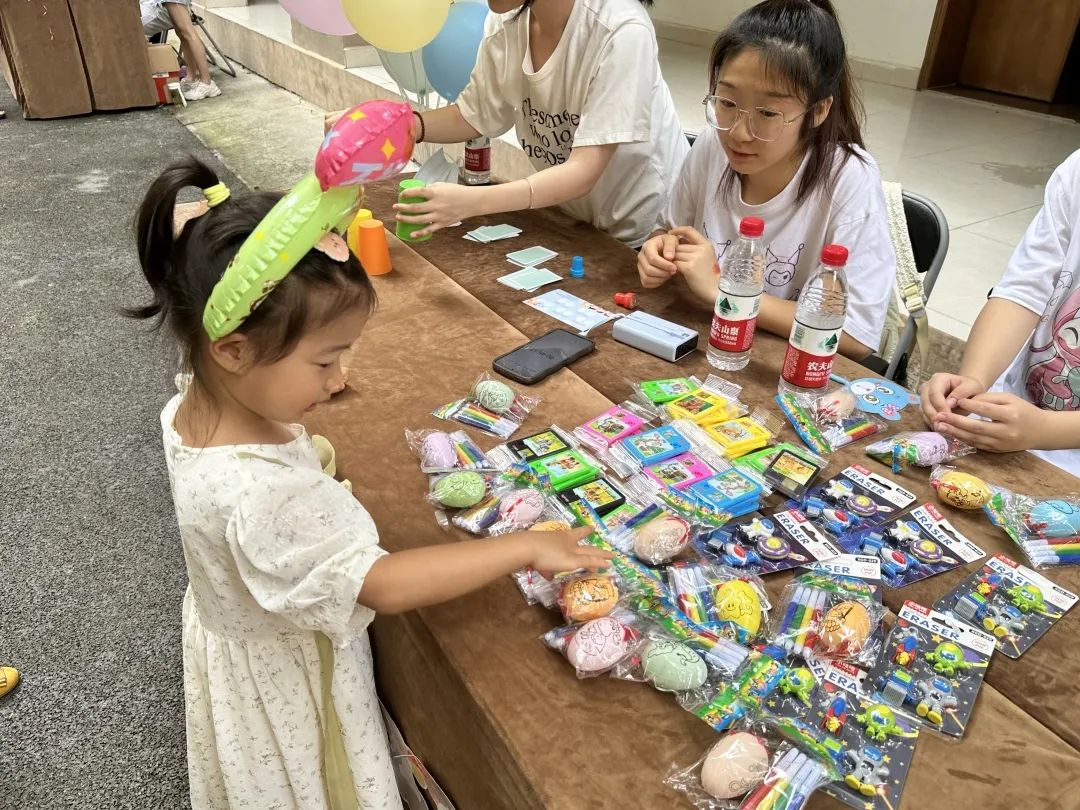 游园活动设置了皮筋夹纸杯、天黑请闭眼、金字塔、亲子抛接、套圈圈等多个游戏摊位,还有小手工制作区、爆米花派发区和快闪小剧场等,每个摊位都趣味盎然。